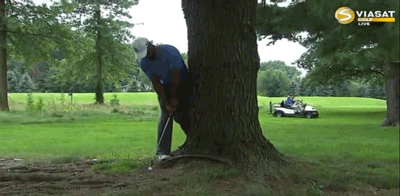 Wayward drive on 6 forces Woods to hit from behind a tree